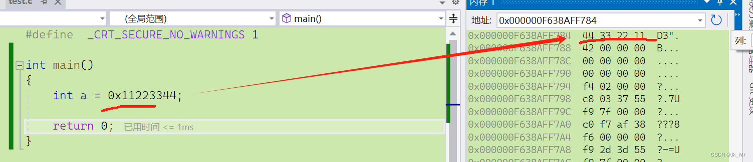 在vs中我们查看内存的时候会发现,我们给一个变量赋值时,它的存储顺序有点和我们所读的顺序不同。如图