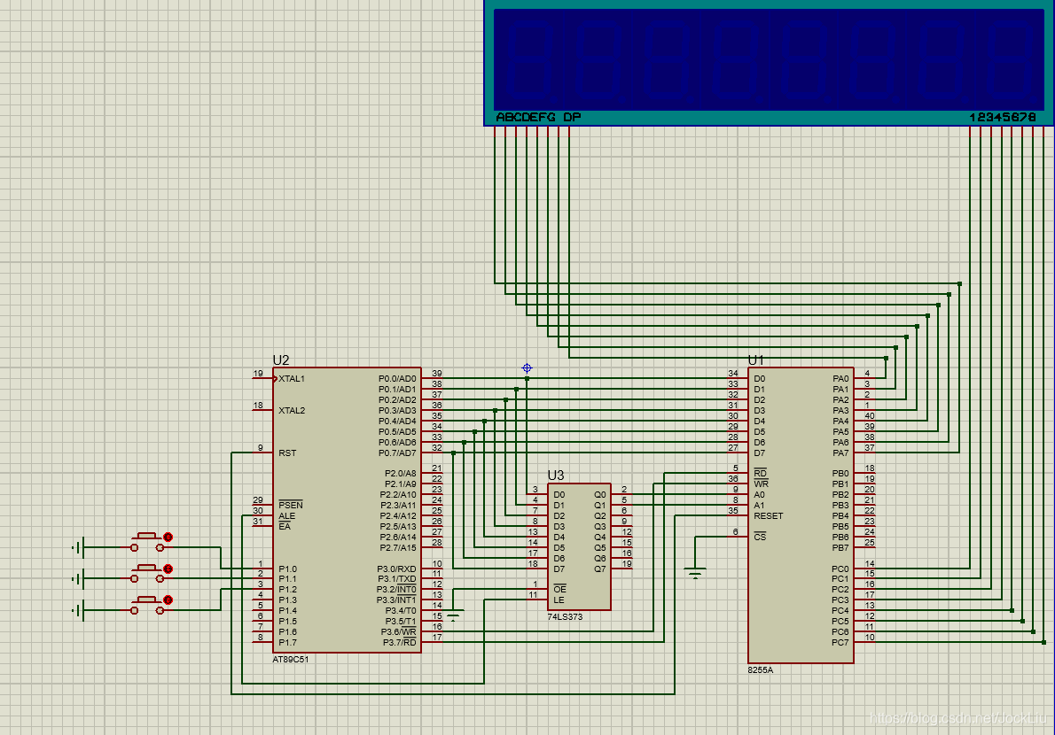 因为外部做了扩展,所以在做仿真的时候思考了很久,为了和实验箱布局一致,我在proteus上还原实验箱的布局。首先是从P0做的扩展,因此要对应8255的输入端口。