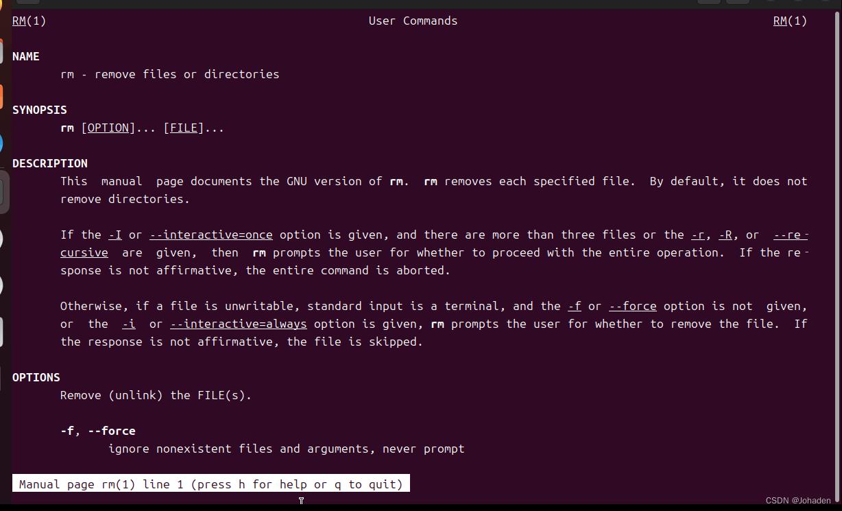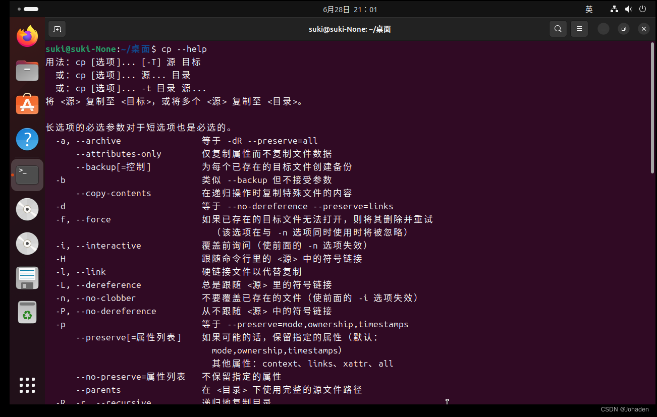 2.我们可以在Ubuntu中直接查看帮助手册,如输入cp --help。(下图并非完整帮助,自行查询)
