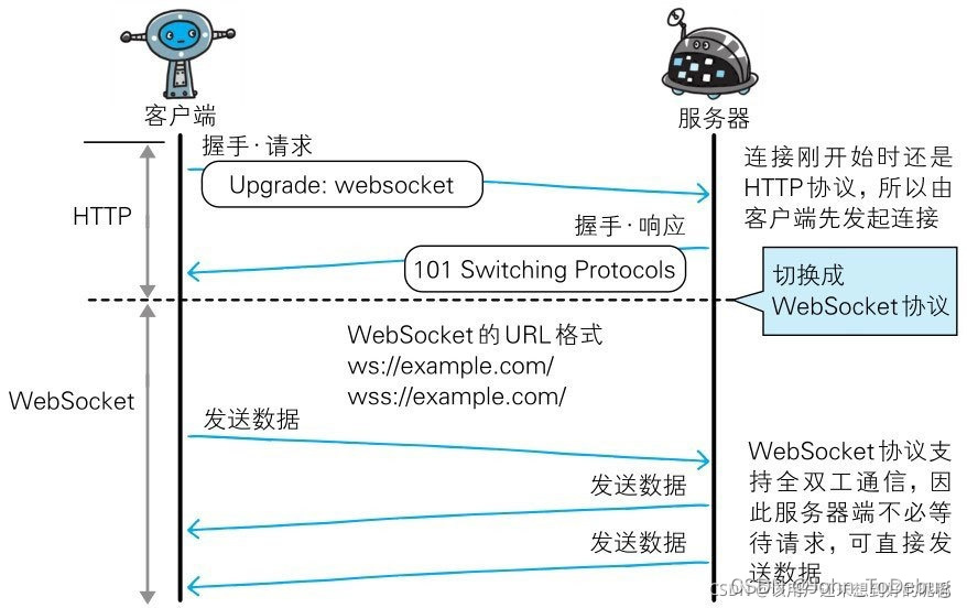 由于是建立在 HTTP 基础上的协议,因此连接的发起方仍是客户端(先通过http建立连接,然后再通过upgrade协议来切换为websocket协议,即握手),而一旦 Web 服务器与客户端之间建立起WebSocket协议的通信连接,之后所有的通信都依靠这个专用协议进行。通信过程中可互相发送JSON、 XML 、 HTML 或图片等任意格式的数据。不论服务器还是客户端,任意一方都可直接向对方发送报文。