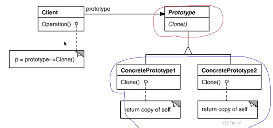 Prototype模式同样用于隔离类对象的使用者和具体类型(易变类)之间的耦合关系,它同样要求这些 “易变类” 拥有 “稳定的接口”