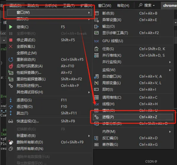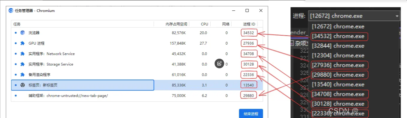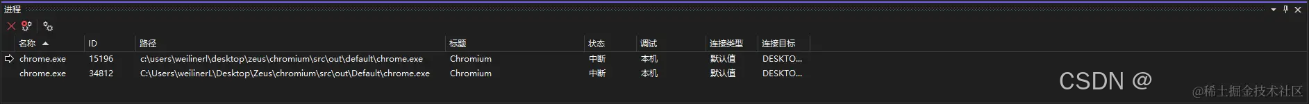 这些进程都叫相同的名字chrome.exe,不好分辨,但我们可以一直调试下去,最终可以打开Chromium的任务管理器查看Chromium中启动的进程,与我们在进程tab中的id进行比较,就可以找到对应的渲染进程、GPU进程、插件进程、网络进程等。