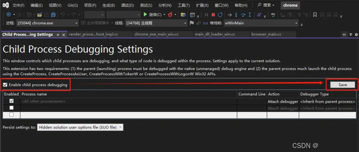 将Enable child process debugging打上勾并保存即可: