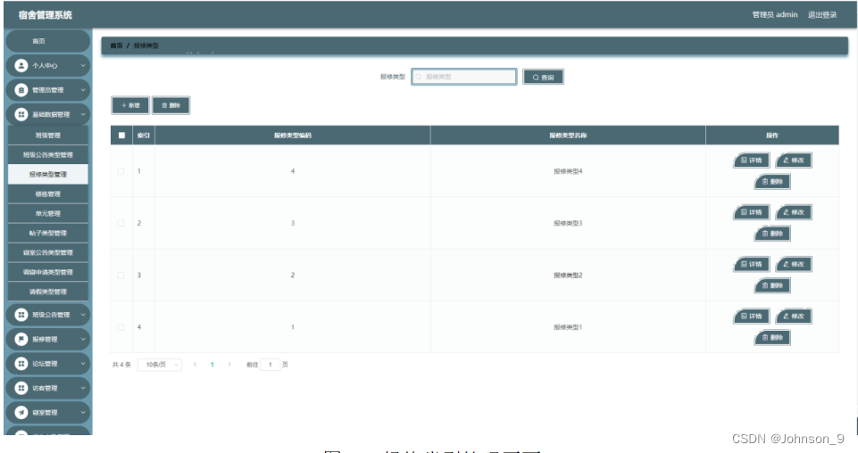 如图5.5显示的就是报修类型管理页面,此页面提供给管理员的功能有:新增报修类型,修改报修类型,删除报修类型。