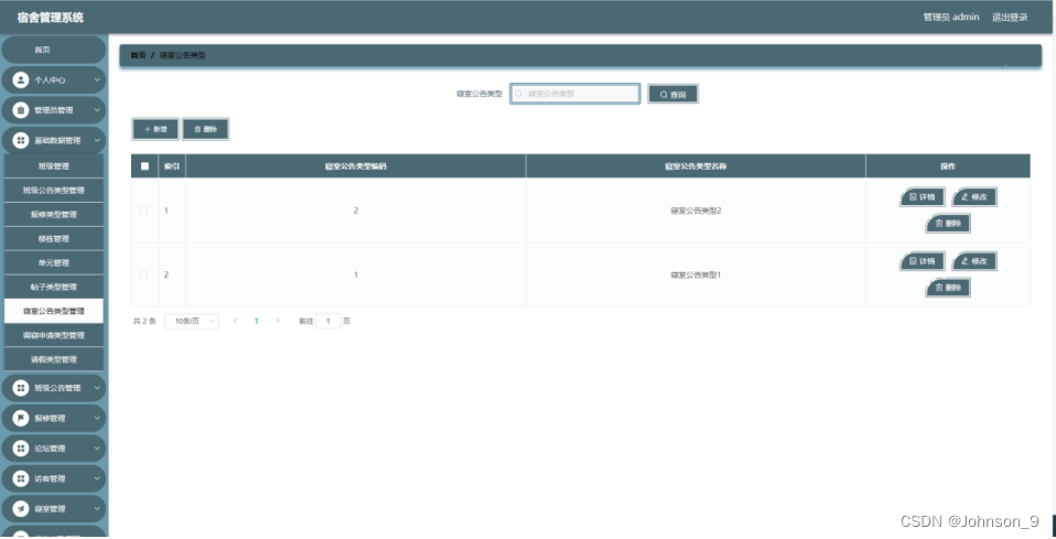 寝室公告类型管理页面显示所有寝室公告类型,在此页面既可以让管理员添加新的寝室公告信息类型,也能对已有的寝室公告类型信息执行编辑更新,失效的寝室公告类型信息也能让管理员快速删除。下图就是寝室公告类型管理页面。