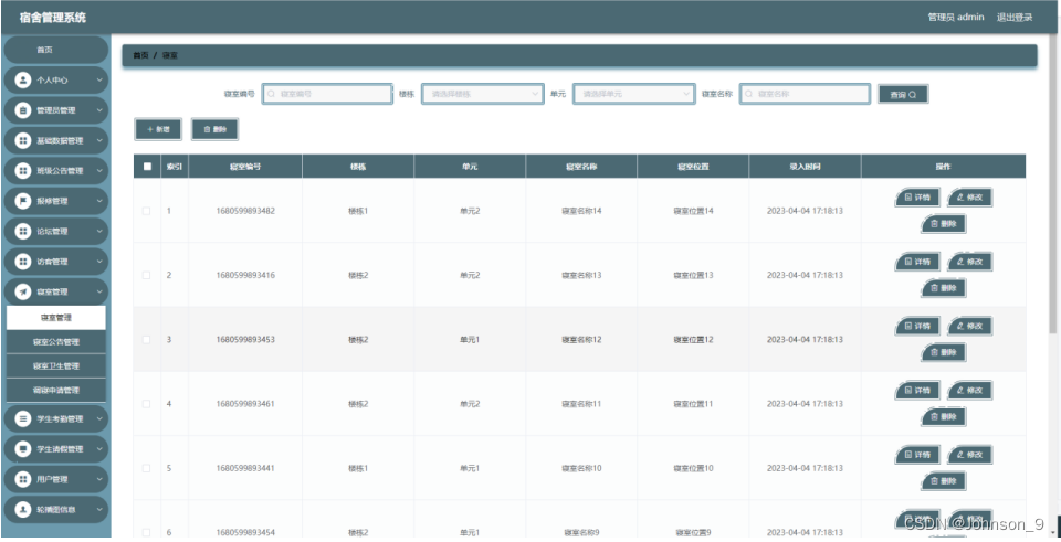 此页面让管理员管理寝室的数据,寝室管理页面见下图。此页面主要实现寝室的增加、修改、删除、查看的功能。