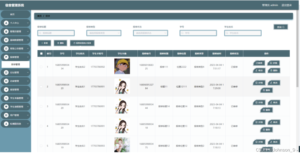 如图5.4显示的就是报修管理页面,此页面提供给管理员的功能有:新增报修,修改报修,删除报修。