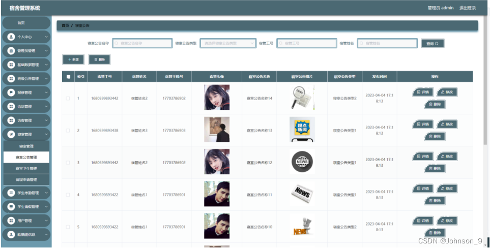 寝室公告信息管理页面提供的功能操作有:新增寝室公告,修改寝室公告,删除寝室公告操作。下图就是寝室公告信息管理页面。