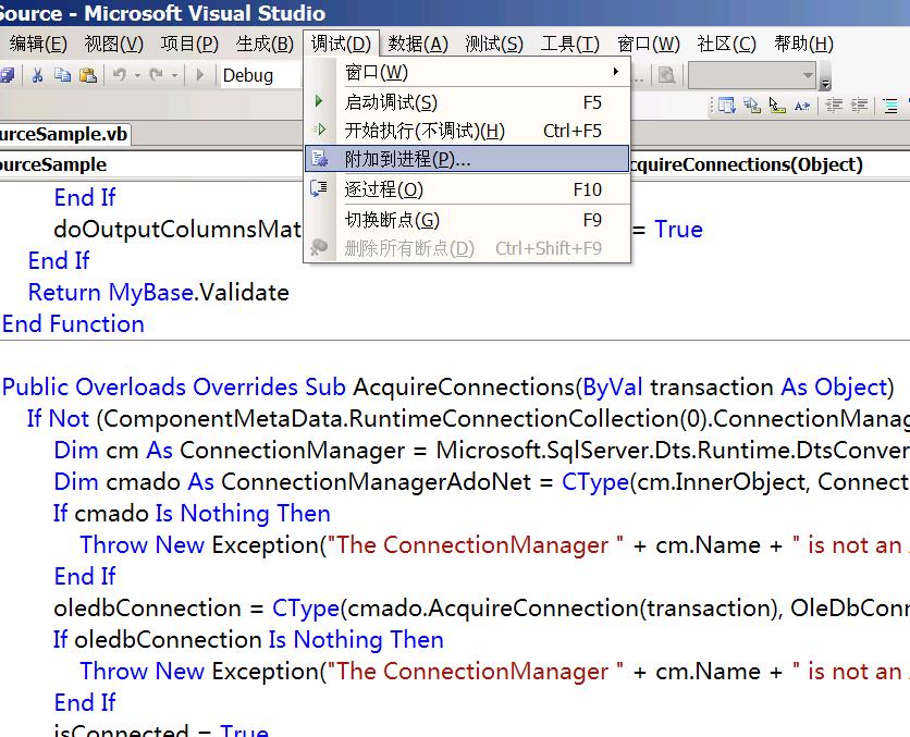 假设我们要在数据流中测试“Ado Source VB”组件(这个组件是SQL Server 2005自带的Sample),在VS_B的数据流中加入一个脚本组件,脚本组件的代码如下: