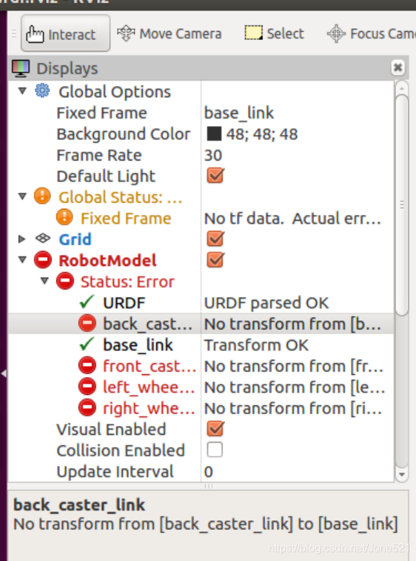 一,运行Rviz时,RobotModle Status:Error 所有的模型提示详细信息都是 No transform from[xxx] to [base_link],如下图,