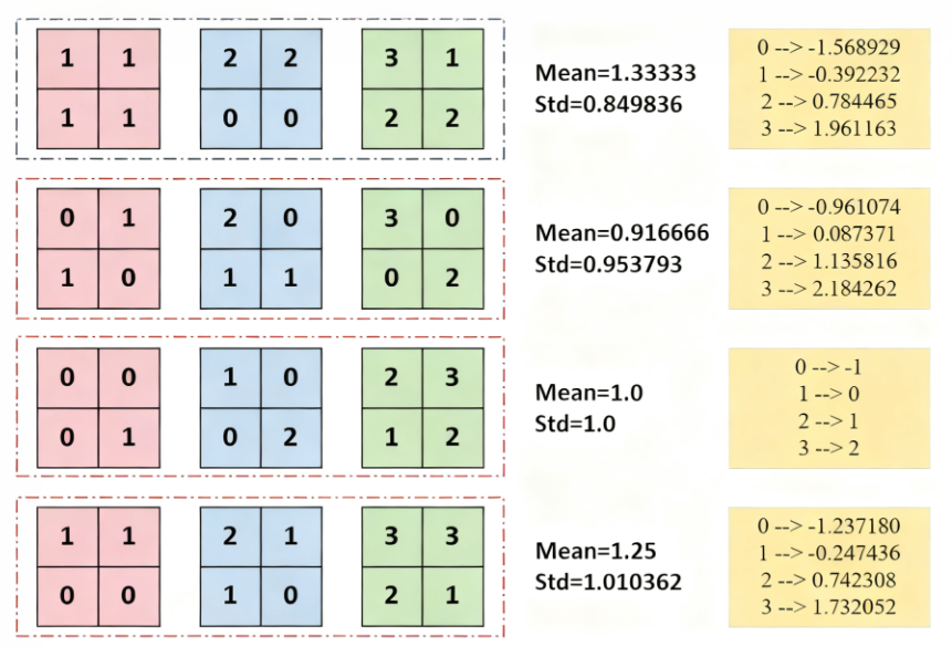 0、1、2、3 就是左侧特征图里的 “原始数字”,是归一化前的输入数据