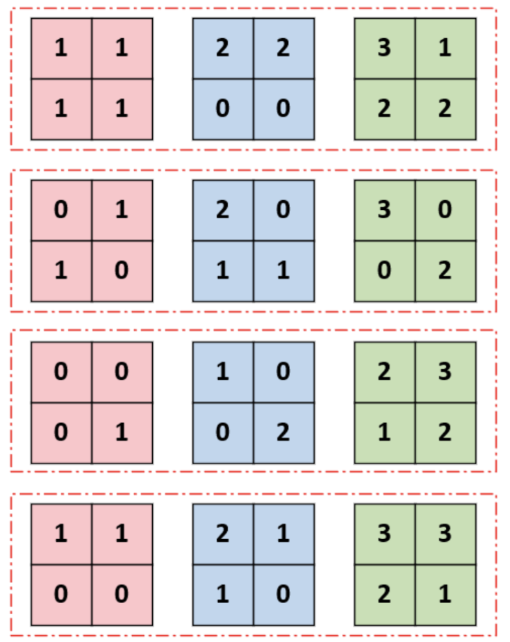 - 通道 3:[[0,0],[0,1]] → 元素:0,0,0,1
