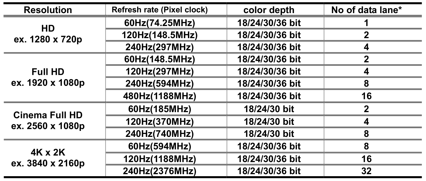 下图格式不全,最高可以支持8K120Hz-64Lane。