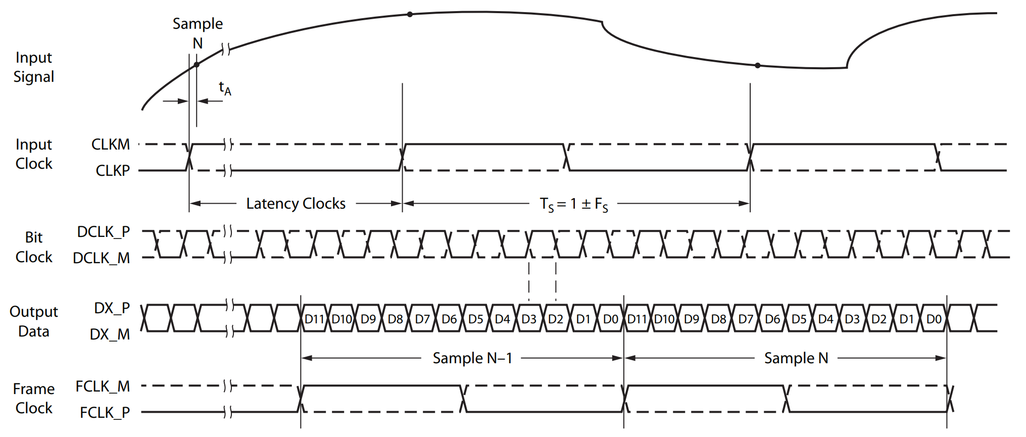 常见的是VESA和JEIDA标准的LVDS,除此之外还1:4、1:8、1:12等等,特别是高速场景的ADC采集、视频传输等等。如下图ADC采集时序图: