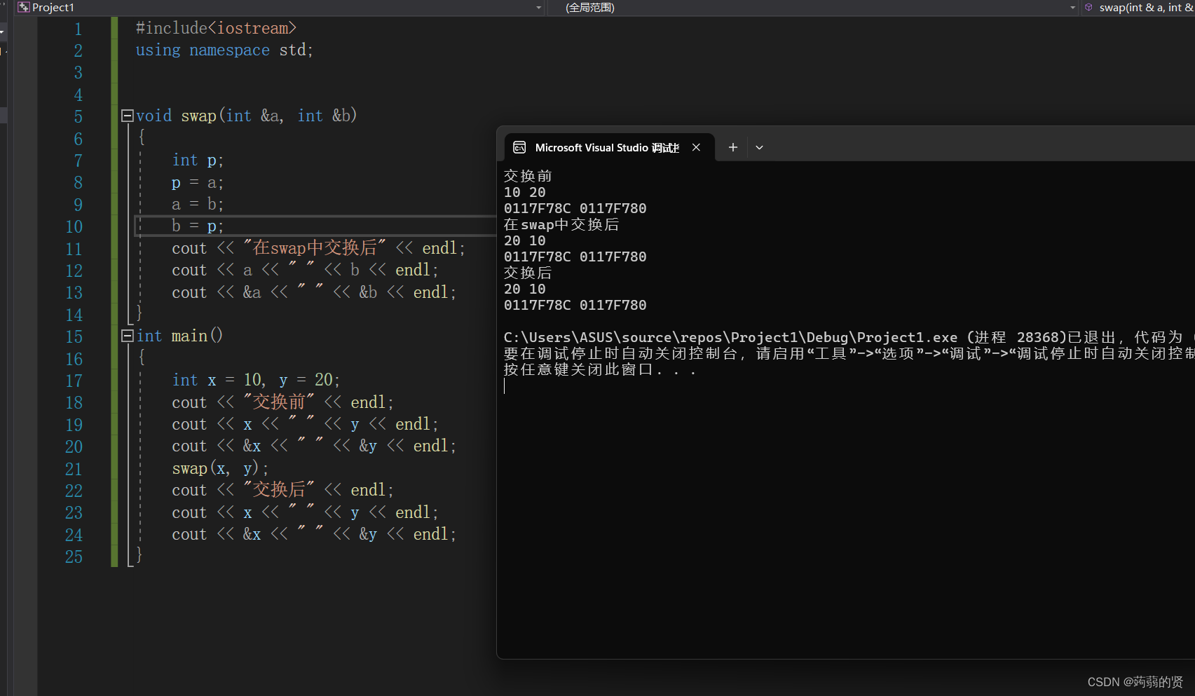 把x,y传给swap,swap使用&a,&b接受。引用就相当于形参通过别名的方式操作实参。