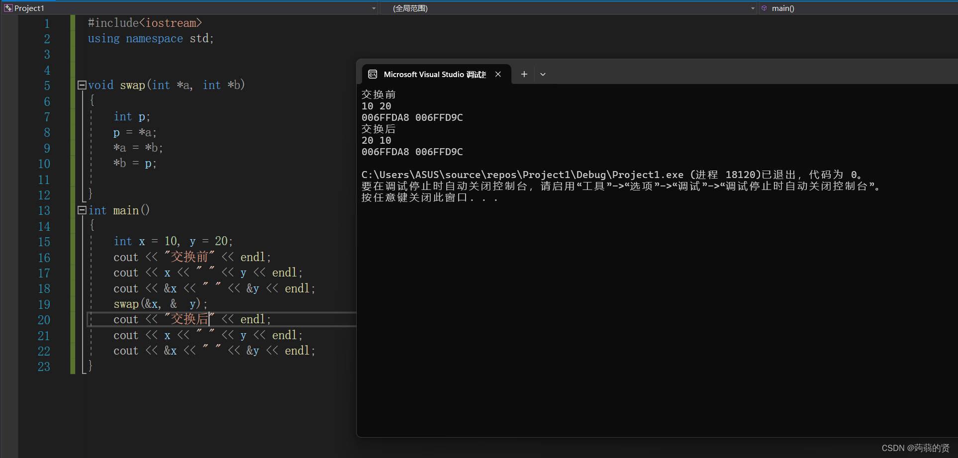 下面再看把x,y的地址&x,&y传给swap,swap使用两个指针变量接受它们。