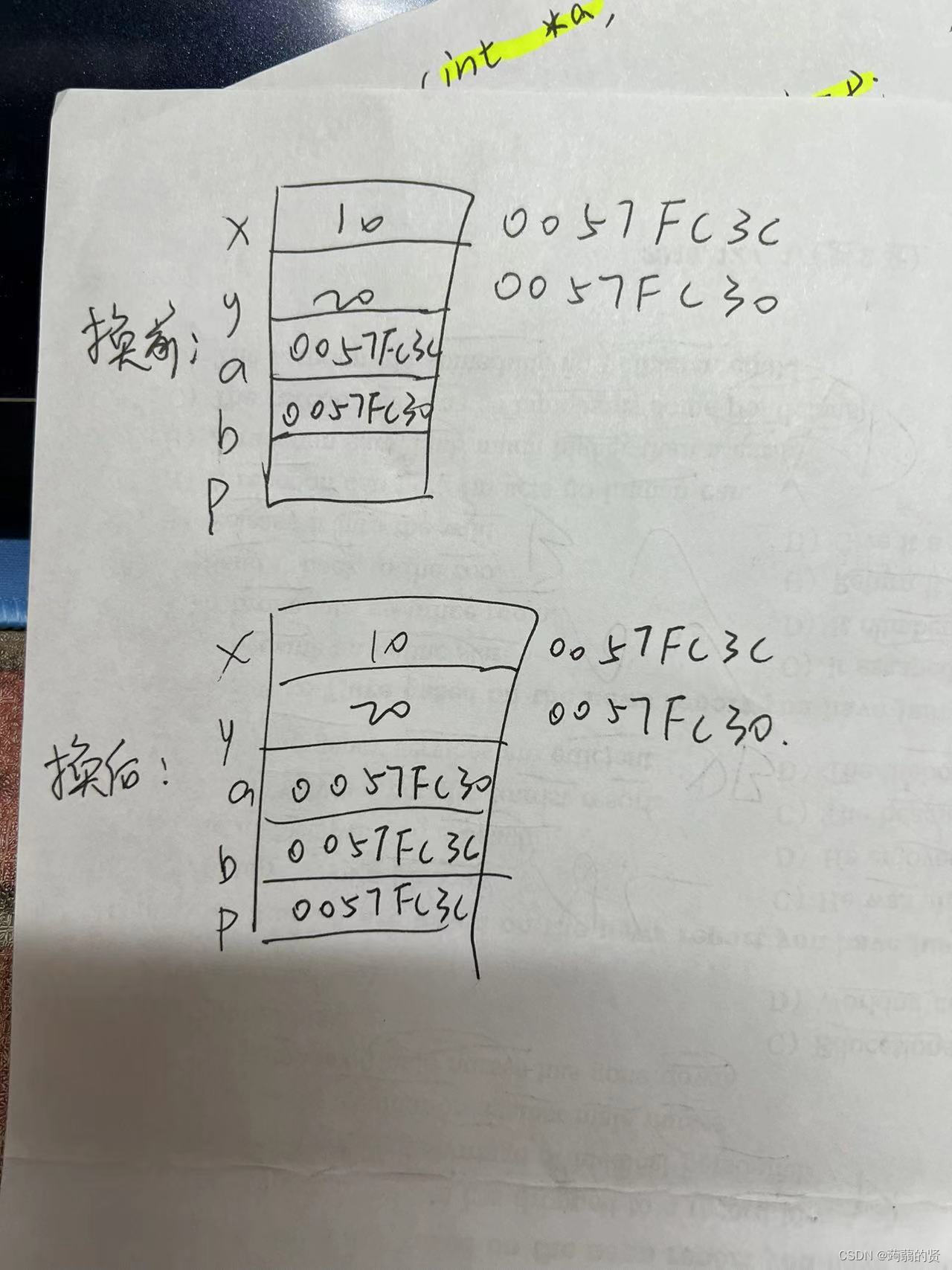 再看交换x和y的指针,这个交换的是a,b指向的地址,并没有交换 x和y的值