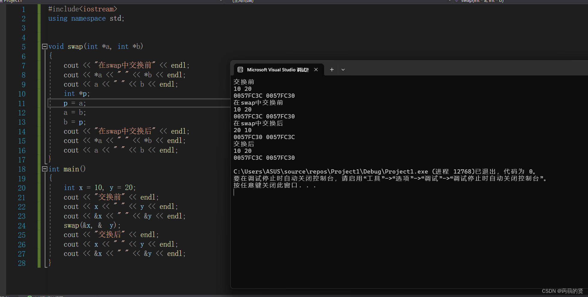 swap中的*a,*b是对地址的解引用,即*a就是x,*b就是y。所以交换了x和y的值