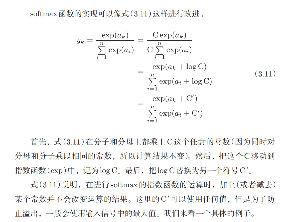 上面的softmax函数的实现虽然正确描述了式(3.10),但在计算机的运算 上有一定的缺陷。这个缺陷就是溢出问题。softmax函数的实现中要进行指 数函数的运算,但是此时指数函数的值很容易变得非常大。比如,e 10的值 会超过20000,e 100会变成一个后面有40多个0的超大值,e 1000的结果会返回 一个表示无穷大的inf。如果在这些超大值之间进行除法运算,结果会出现“不 确定”的情况。