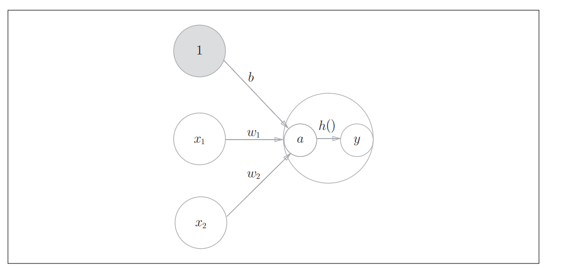 如图所示,表示神经元的○中明确显示了激活函数的计算过程,即信号的加权总和为节点a,然后节点a被激活函数h()转换成节点y。本书中,“神经元”和“节点”两个术语的含义相同。这里,我们称a和y为“节点”,其实它和之前所说的“神经元”含义相同。