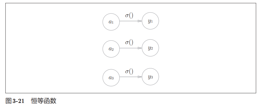 恒等函数会将输入按原样输出,对于输入的信息,不加以任何改动地直 接输出。因此,在输出层使用恒等函数时,输入信号会原封不动地被输出。 另外,将恒等函数的处理过程用之前的神经网络图来表示的话,则如图3-21 所示。和前面介绍的隐藏层的激活函数一样,恒等函数进行的转换处理可以 用一根箭头来表示。