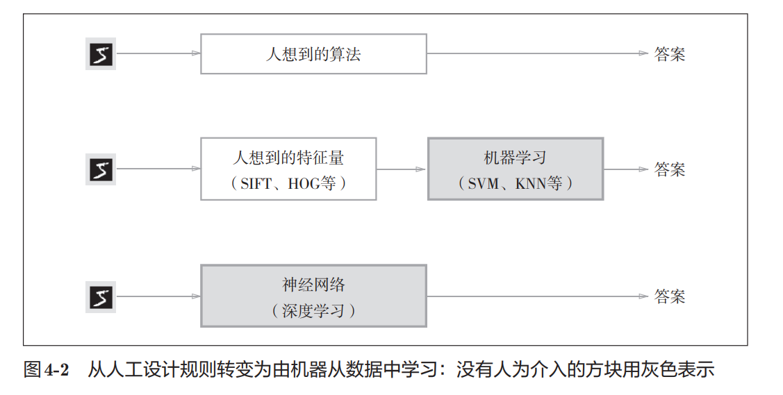 神经网络的优点是对所有的问题都可以用同样的流程来解决。比如,不 管要求解的问题是识别5,还是识别狗,抑或是识别人脸,神经网络都是通 过不断地学习所提供的数据,尝试发现待求解的问题的模式。也就是说,与 待处理的问题无关,神经网络可以将数据直接作为原始数据,进行“端对端” 的学习。