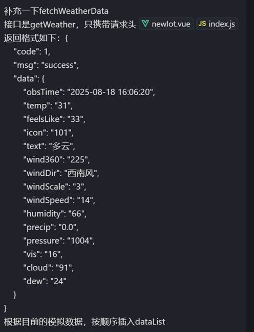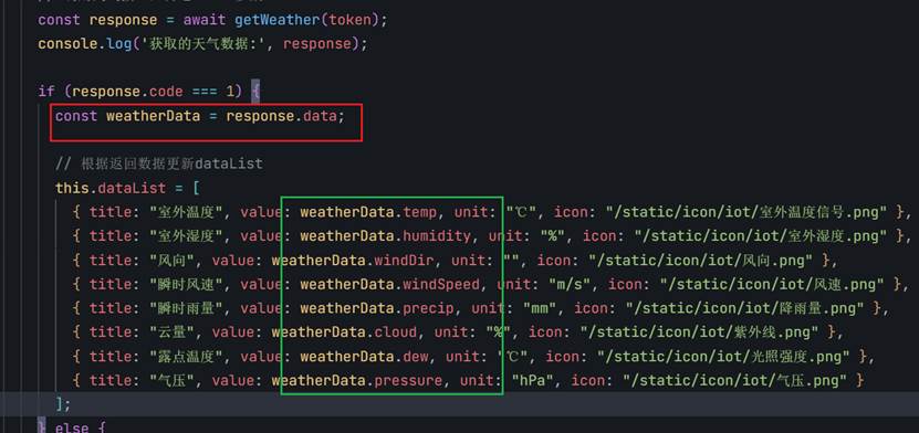 比如绿色的框是要渲染到页面的,如果不渲染,就说明weatherData数组中可能没有后面的字段,这时候就看一下apifox返回的数据结构,把字段对应。