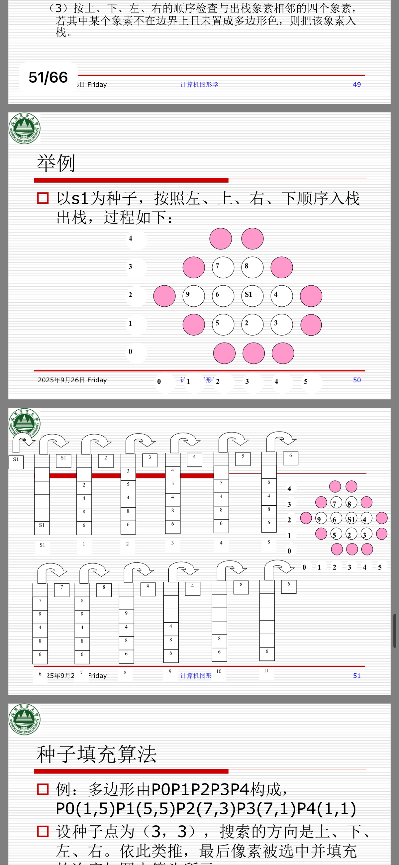 老师讲的四邻域种子填充算法,是像素出栈了就不再进栈。如果没有出栈就可以继续进栈(包括没有进过栈的 和现在在栈里面的)。网上也有视频是,只要在栈里面就不再二次进栈了,我也不知道哪个对,问一下豆包