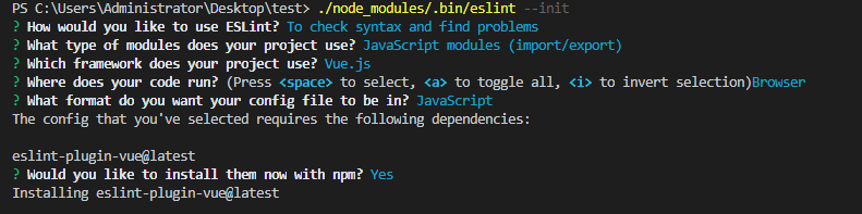 因为没有全局安装eslint,所以在项目中执行(初始化eslint文件)