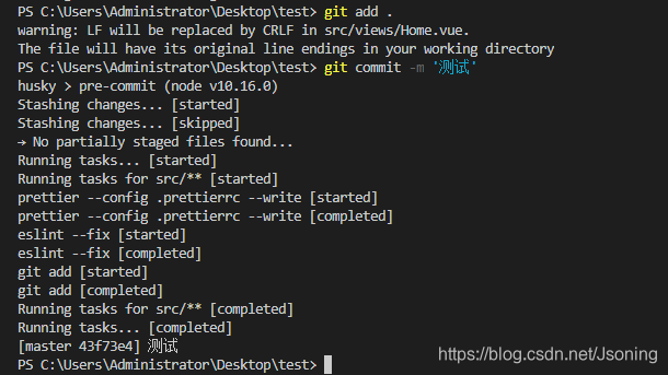 此时就会自动格式化后进行eslint校验,如果有错误的话,commit会失败,并给出eslint提示的错误,修改后再次提交就可以了,下面是成功的例子