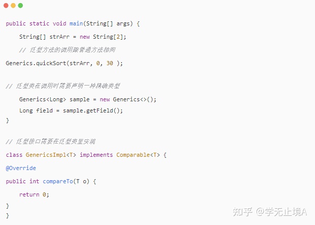 - 如果有参数类型相关的逻辑,那么就需要考虑这些逻辑是否已有共同的接口实现,如果已有共同的接口实现,可以使用边界限定通配符。如快排的元素就实现了