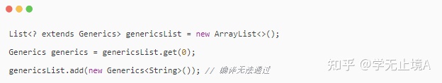 我们会发现最后一行编译报错,至于为什么,可以如此理解:XX 是继承了 Generics 的类,List 中取出来的类一定是可以转换为 Generics,所以 get 方法没问题;而具体是什么类,我们并不知道,将父类强制转换成子类可能会造成运行期错误,所以编译器不允许这种情况;