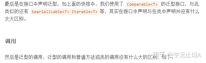 最后是在接口中声明泛型,如上面的快排中,我们使用了 Comparable<T> 的泛型接口,与此类似的还有 Searializable<T> Iterable<T>等,其实在接口中声明与在类中声明并没有什么太大区别。