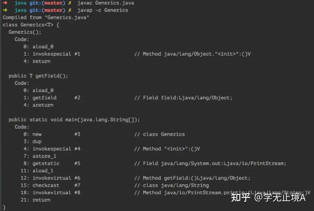 我们将一段泛型代码用 javac 命令编译成 class 文件后,再使用 javap 命令查看其字节码信息: