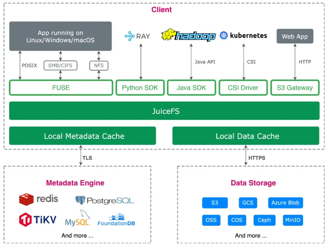 JuiceFS 是一个为云原生环境设计的分布式 POSIX 文件系统。它采用元数据与数据分离架构,从而实现了对跨多个存储后端的大型数据集的高效管理。JuiceFS 提供了极高的可扩展性,适用于需要多个节点并行访问数据的场景,如大规模的 AI/ML 工作负载。