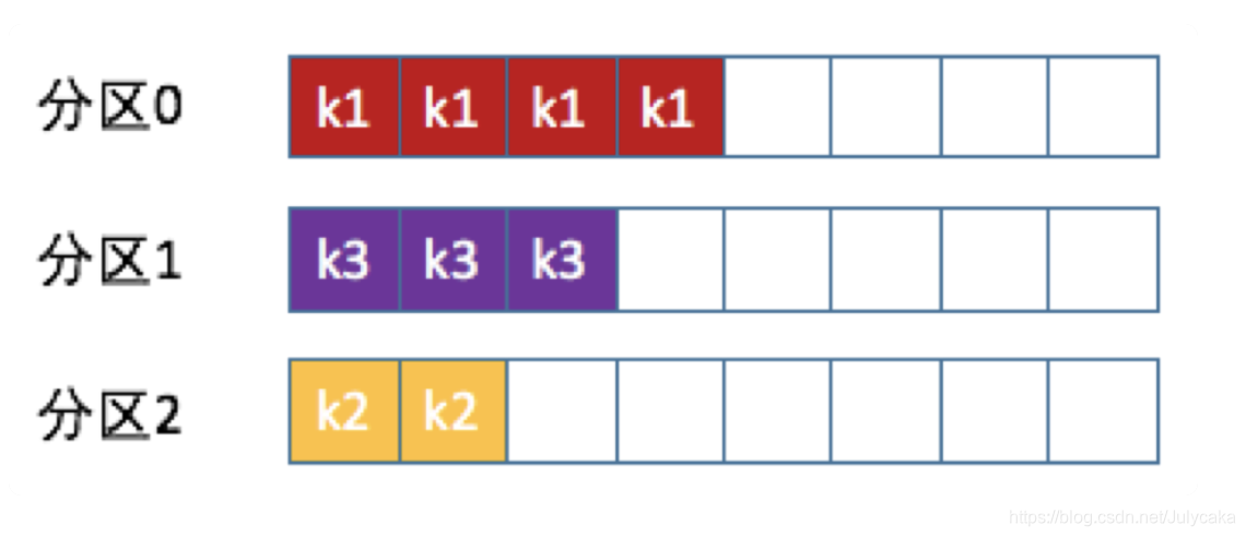 按消息键保序策略:Kafka 支持为每条消息定义消息键 Key。一旦消息被定义了 Key,就可以保证同一个 Key 的所有消息都进入到相同的分区里面,由于每个分区下的消息处理都是有顺序的,故这个策略被称为按消息键保序策略。