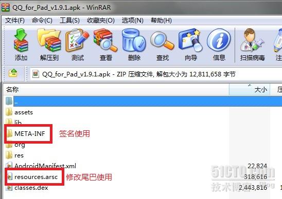 4.用压缩软件如:winrar,好压等打开QQ for pad包,打开后别关闭了。(右击—打开方式—选择winrar即可。)将其中的resources.arsc单独解压提取出来。如下图: