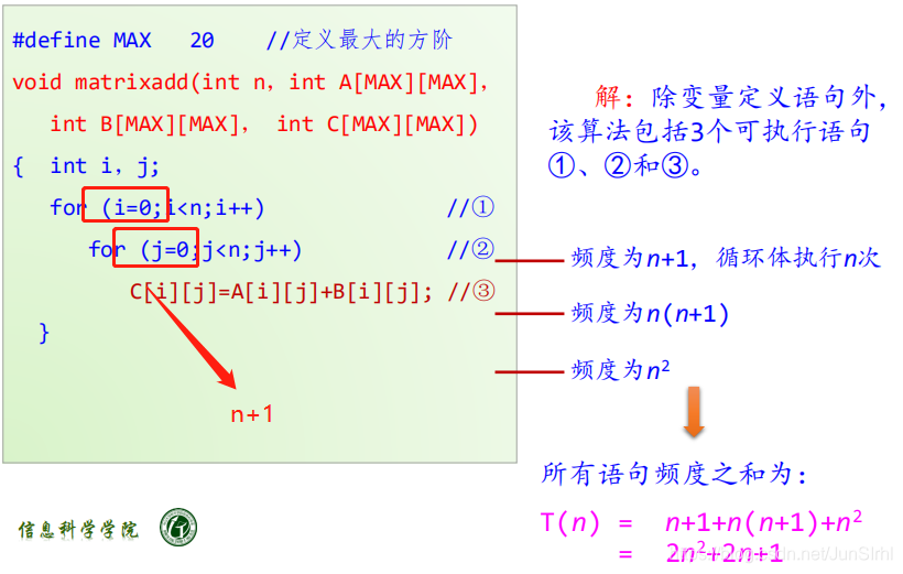 注意:关于(1)为什么频度是n+1,主要是因为 i自增到n的时候,判定不通过,这步判定算1,而该循