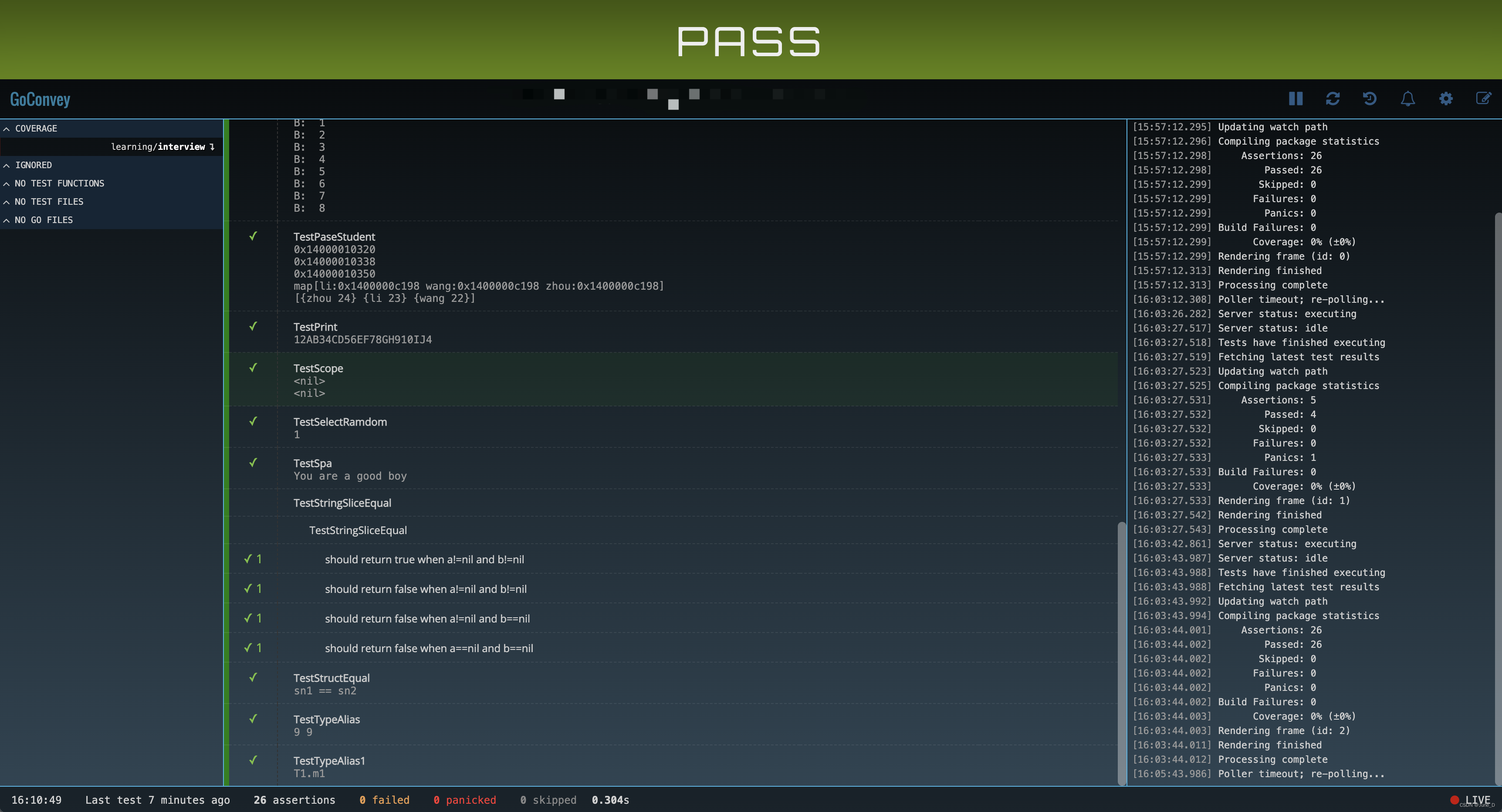 3. 实时测试监控:GoConvey可以实时监控代码的变化,并自动运行相关的测试用例,帮助开发者及时发现代码变更对测试的影响。