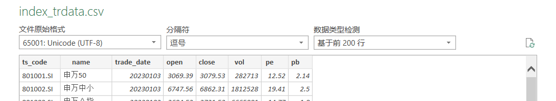 data_i.columns = ['指数代码', '行业名称', '交易日期', '开盘指数', '收盘指数', '成交量', '市盈率', '市净率']