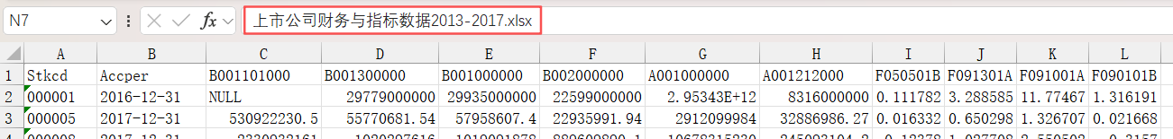 基于上一关的结果,读取“上市公司财务与指标数据2013-2017.xlsx”数据,其中字段依次为: