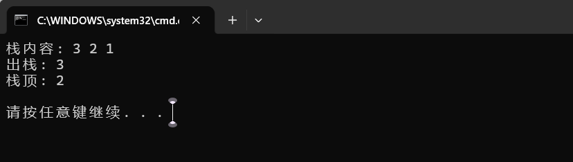 printf("出栈: %d\n", val); // 输出:出栈: 3