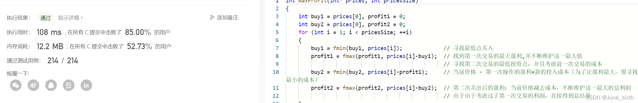 profit1 = fmax(profit1, prices[i]-buy1); // 找到第一次交易的最大盈利,并不断维护这一最大值
