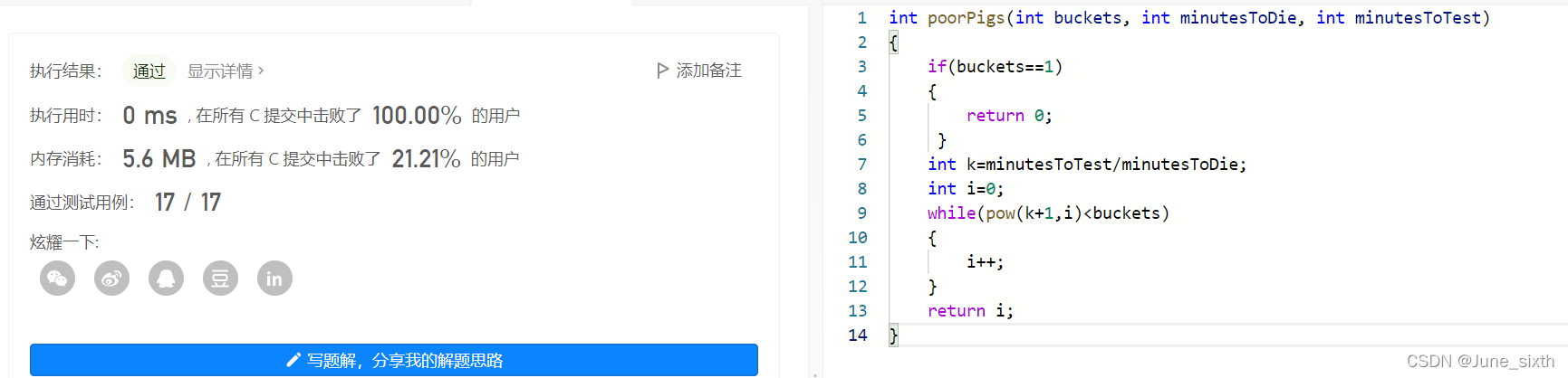由此:我们可以推断:检索k轮,i 只猪,最多可以检测 [(k+1)^ i ]桶水,当k大于3之后,对于 k 维空间 水 的排列和检索也是可以实现的,分析到这里,这道题也变得非常简单了,实际上就是在知道 k 的情况下求最小的 i 使得 [(k+1)^ i ]大于等于buckets即可。