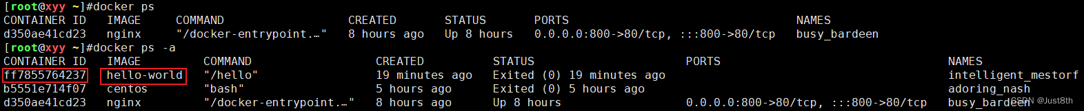这个报错就是说,hello-world这个镜像正在被 ff7855764237这个容器使用,不能删除。这时候通过docker ps查看正在运行中的容器又没有看到 ff7855764237 这个容器。docker ps只能查看正在运行的容器,对于停止的容器是看不到的,所以使用docker ps -a命令查看所有的容器。找到这个容器然后删除它