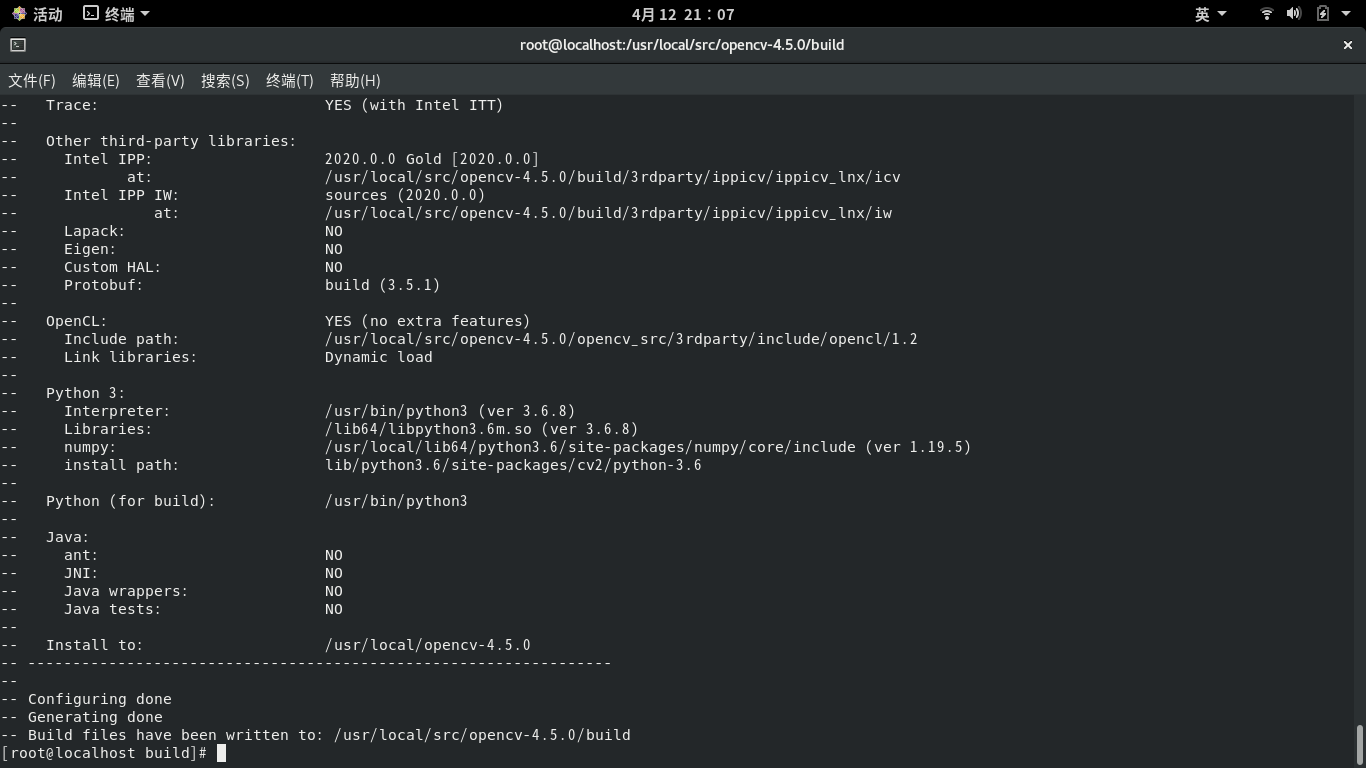 第一个参数就是指定编译外部模块,如果想要编译特定的外部模块,就把path指向模块所在的路径就可以了。prefix指定要把opencv安装到哪里去。pkgconfig=on表示生成.pc文件。最后告诉cmake源码路径。