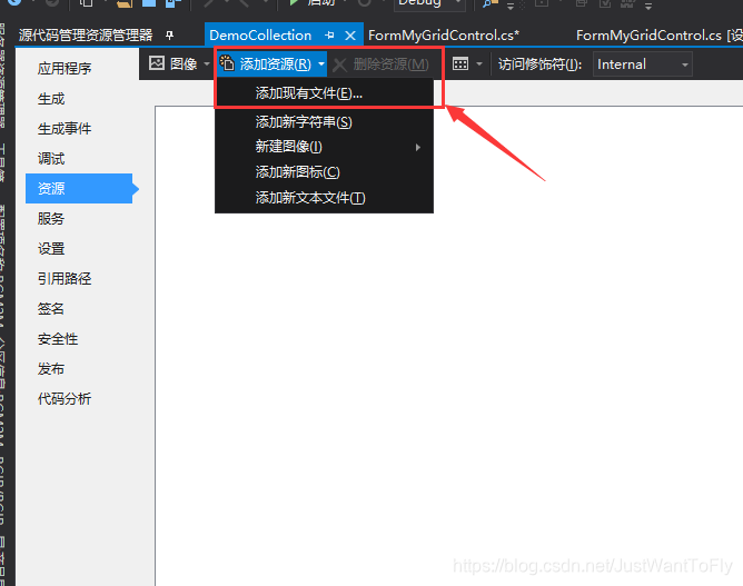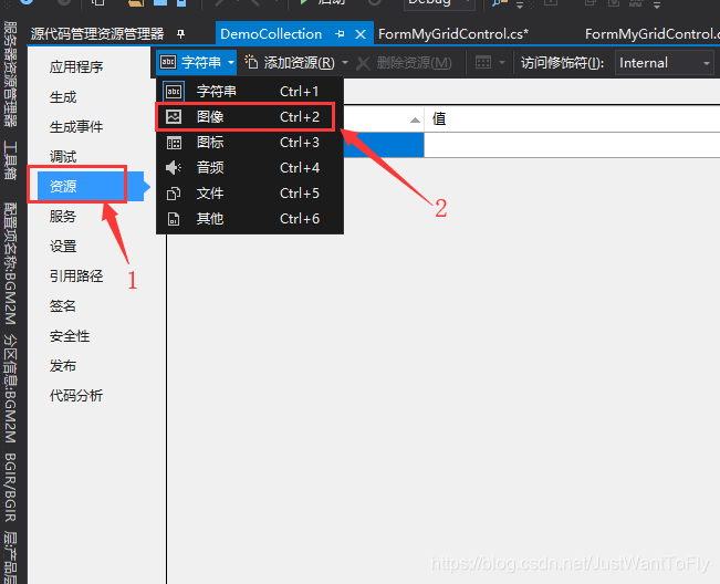 (2.2)在属性中选中资源,然后在上方选中字符串旁边的下三角,在下拉出来的数据中选择图像;之后选择添加资源旁边的下三角,在下拉出来的数据中选择添加现有文件,在本地路径选中需要添加的图片即可