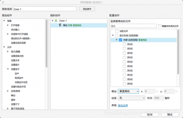 选中【显示区域】面板,添加【拖动时】用例,添加【移动】动作,勾选【内容】面板,移动方式为【垂直移动】,点击确定。