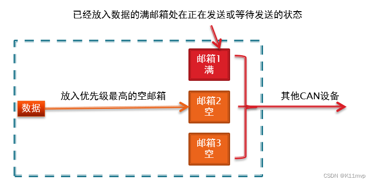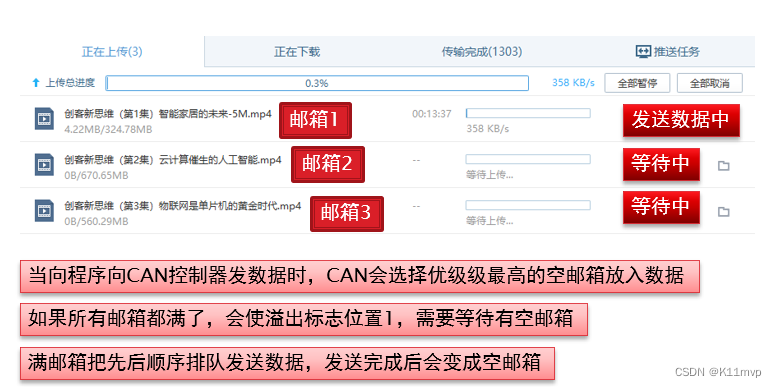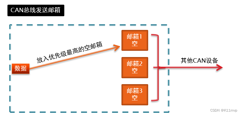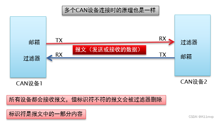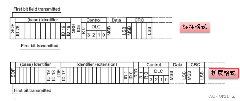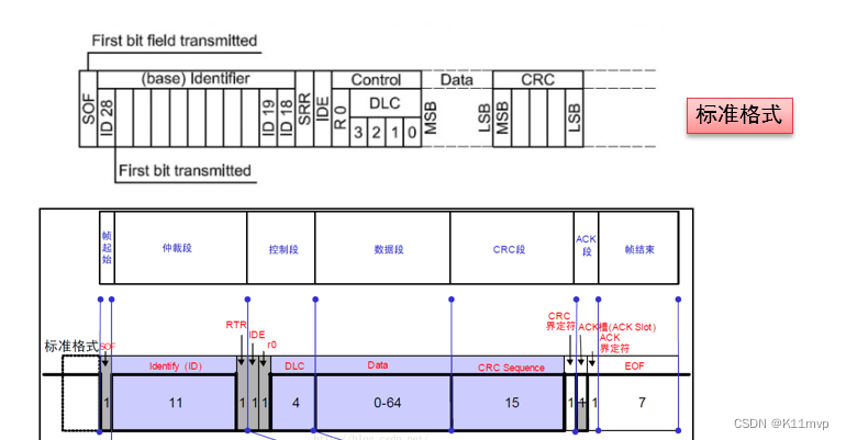 在 CAN 协议中,所有的消息都以固定的格式发送。总线空闲时,所有与总线相连的单元都可以开始发送新消息。两个以上的单元同时开始发送消息时,根据标识符(Identifier 以下称为 ID)决定优先级。ID 并不是表示发送的目的地址,而是表示访问总线的消息的优先级。两个以上的单元同时开始发送消息时,对各消息 ID 的每个位进行逐个仲裁比较。仲裁获胜(被判定为优先级最高)的单元可继续发送消息,仲裁失利的单元则立刻停止发送而进行接收工作