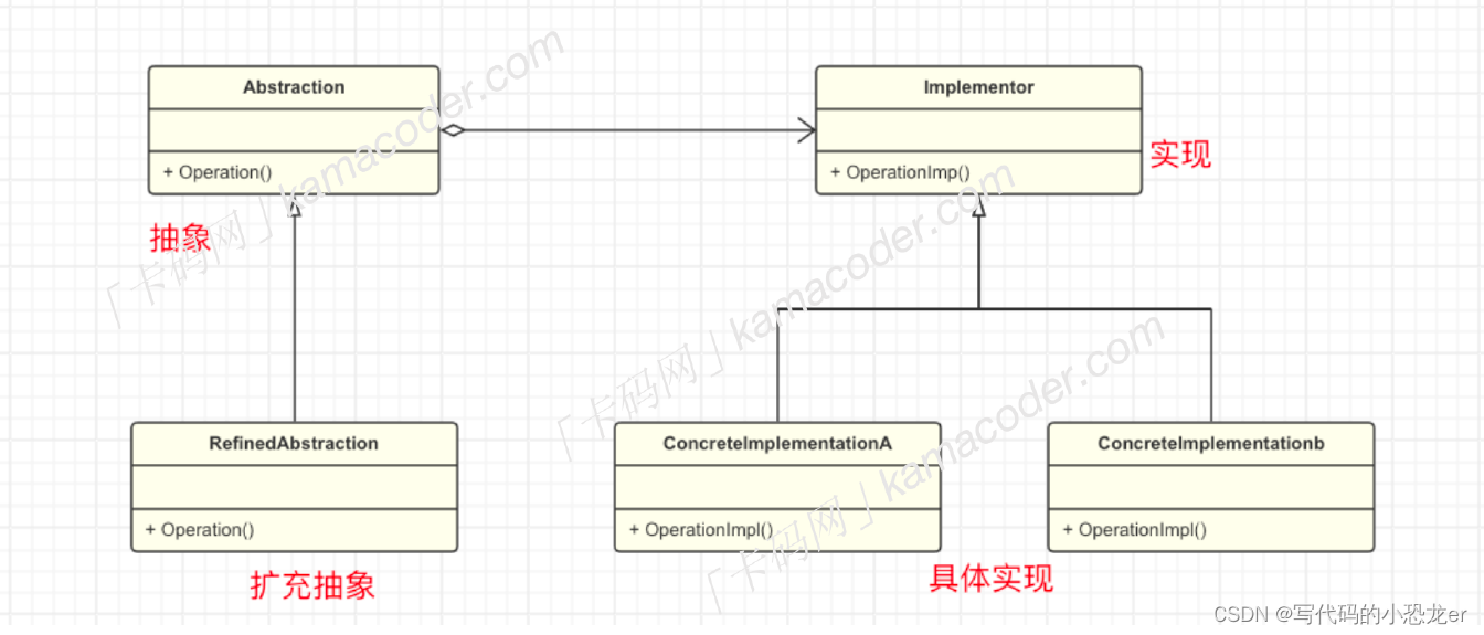 - 抽象Abstraction :⼀般是抽象类,定义抽象部分的接⼝,维护⼀个对【实现】的引⽤。